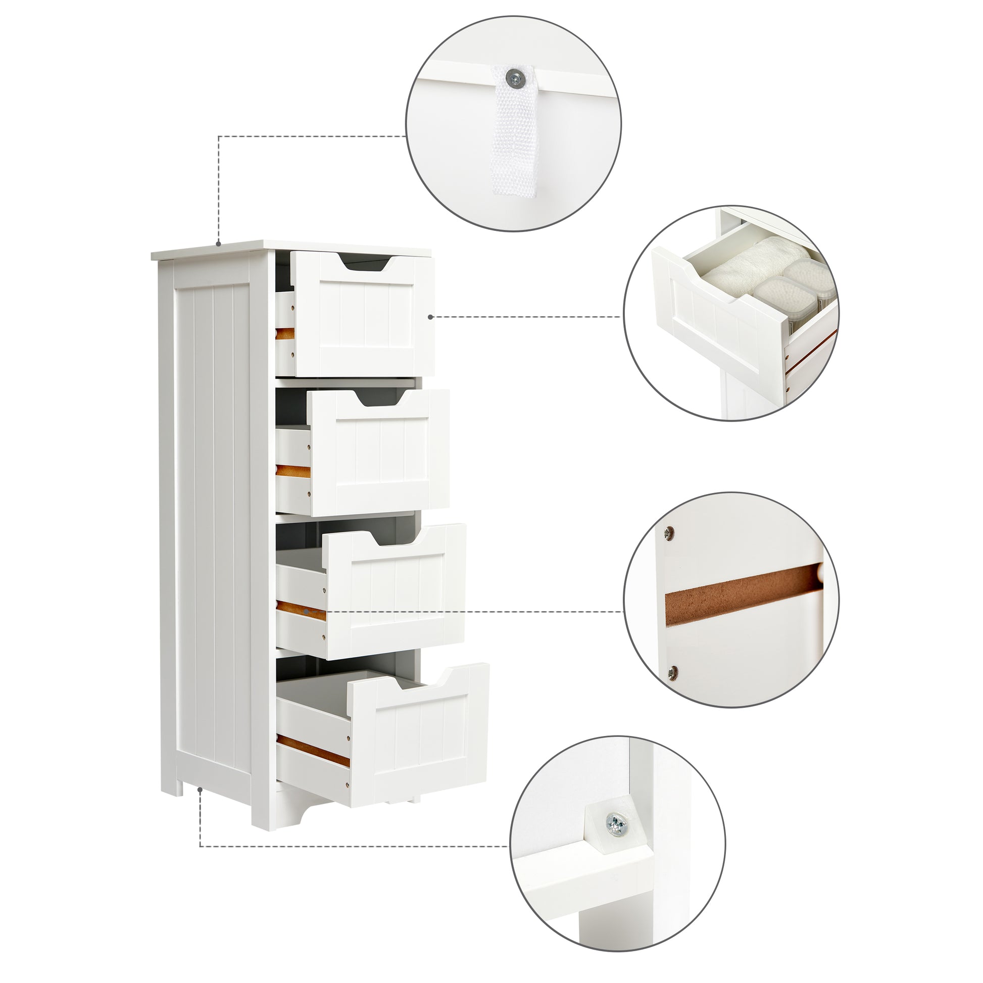 - Large Storage Space: Because it is a bathroom cabinet with four drawers, you can store towels, toilet paper, books, CDs, toys, and other items in the best way. In addition, its surface provides enough space for lights, magazines, bottles, or glasses.
