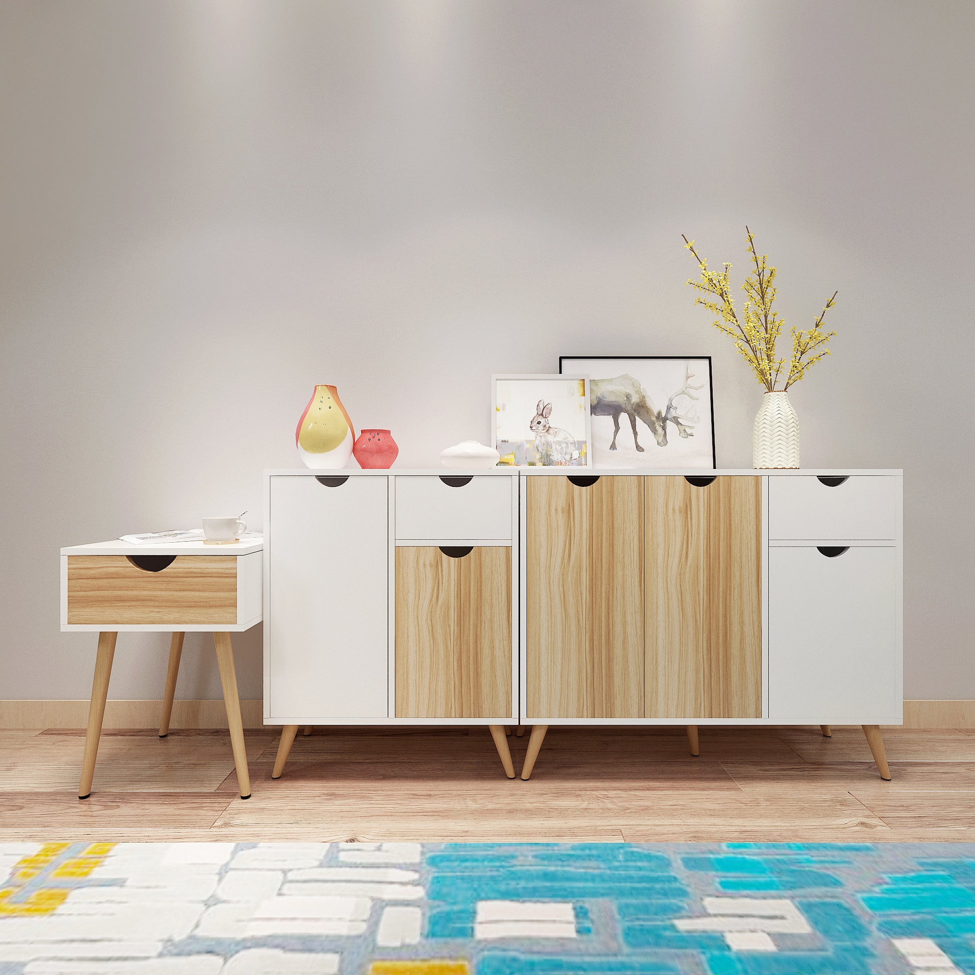 Modern Storage Cabinet, White and Oak Color Matching, Single Drawer